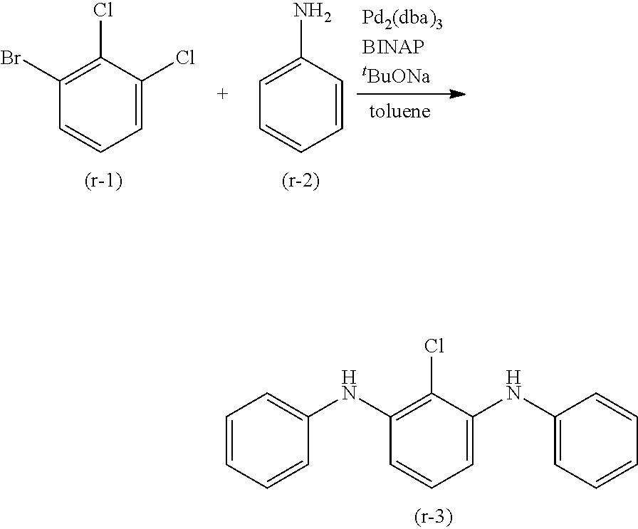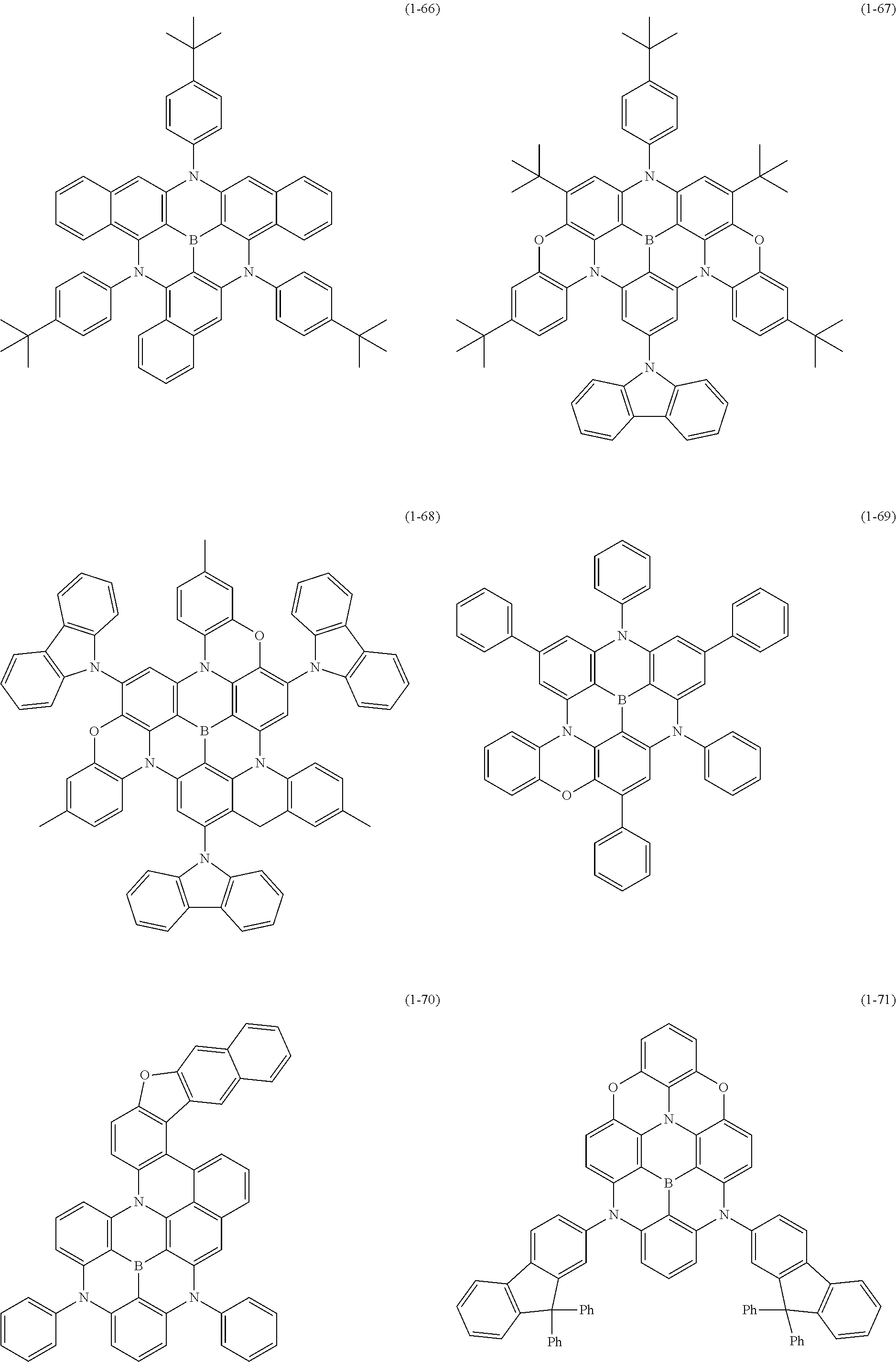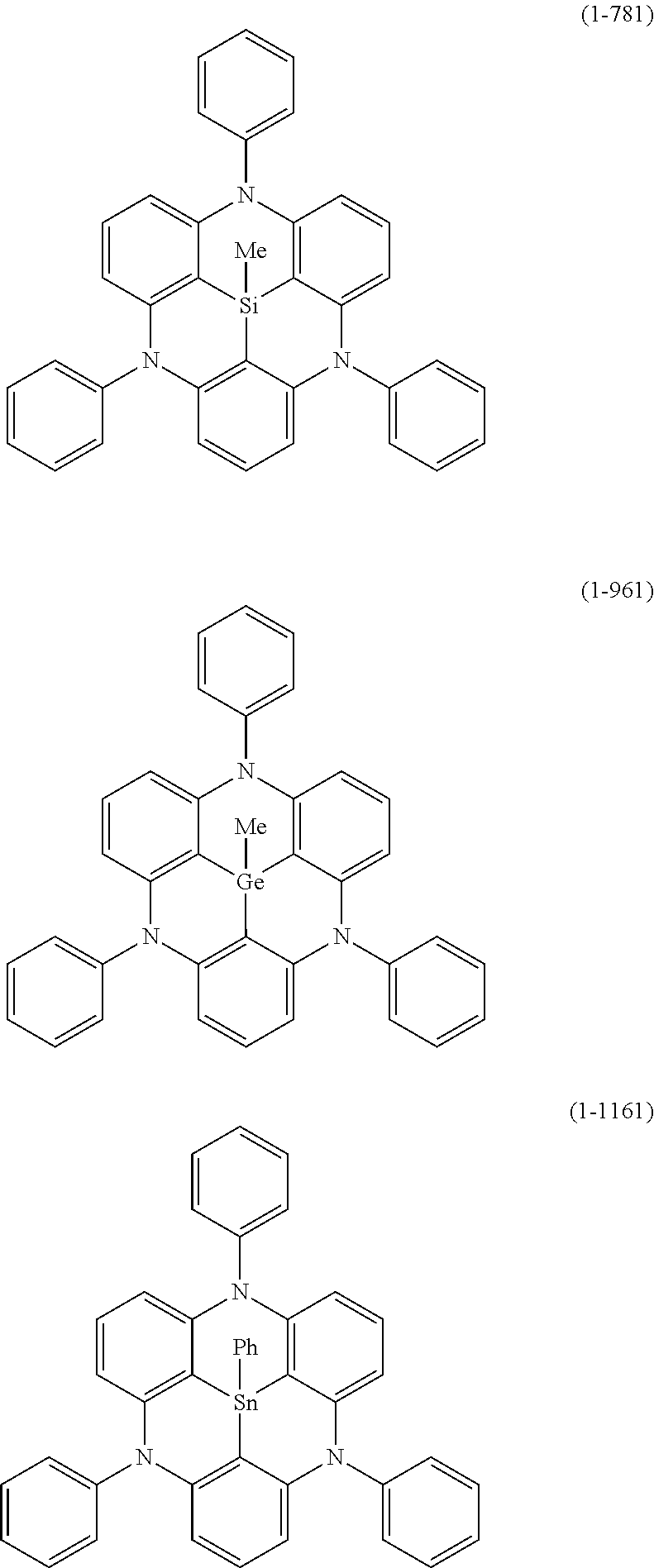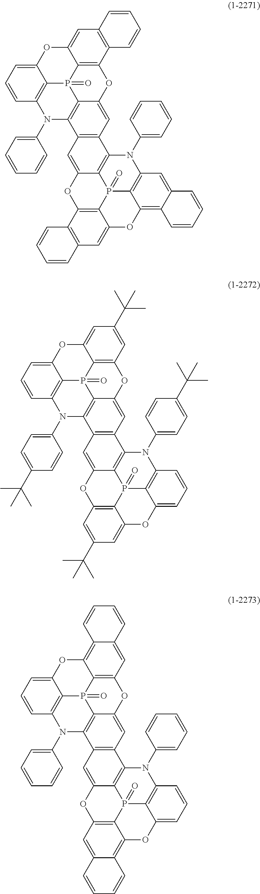 At least one hydrogen atom in the above “aryl ring” or “heteroaryl ring” may be substituted by a substituted or unsubstituted “aryl”, a substituted or unsubstituted “heteroaryl”, a substituted or unsubstituted “diarylamino”, a substituted or unsubstituted “diheteroarylamino”, a substituted or unsubstituted “arylheteroarylamino”, a substituted or unsubstituted “alkyl”, a substituted or unsubstituted “cycloalkyl”, a substituted or unsubstituted “alkoxy”, a substituted or unsubstituted “aryloxy”, a substituted or unsubstituted arylsulfonyl, a substituted or unsubstituted diarylphosphine, a substituted or unsubstituted diarylphosphine oxide, or a substituted or unsubstituted diarylphosphine sulfide, which is a primary substituent. Examples of the aryl of the “aryl”, “heteroaryl”, and “diarylamino”, the heteroaryl of the “diheteroarylamino”, the aryl and heteroaryl of the “arylheteroarylamino”, the aryl of the “aryloxy”, the aryl of the “arylsulfonyl”, the aryl of the “diarylphosphine”, the aryl of the “diarylphosphine oxide”, and the aryl of the “diarylphosphine sulfide”, as these primary substituents include a monovalent group of the “aryl ring” or “heteroaryl ring” described above.