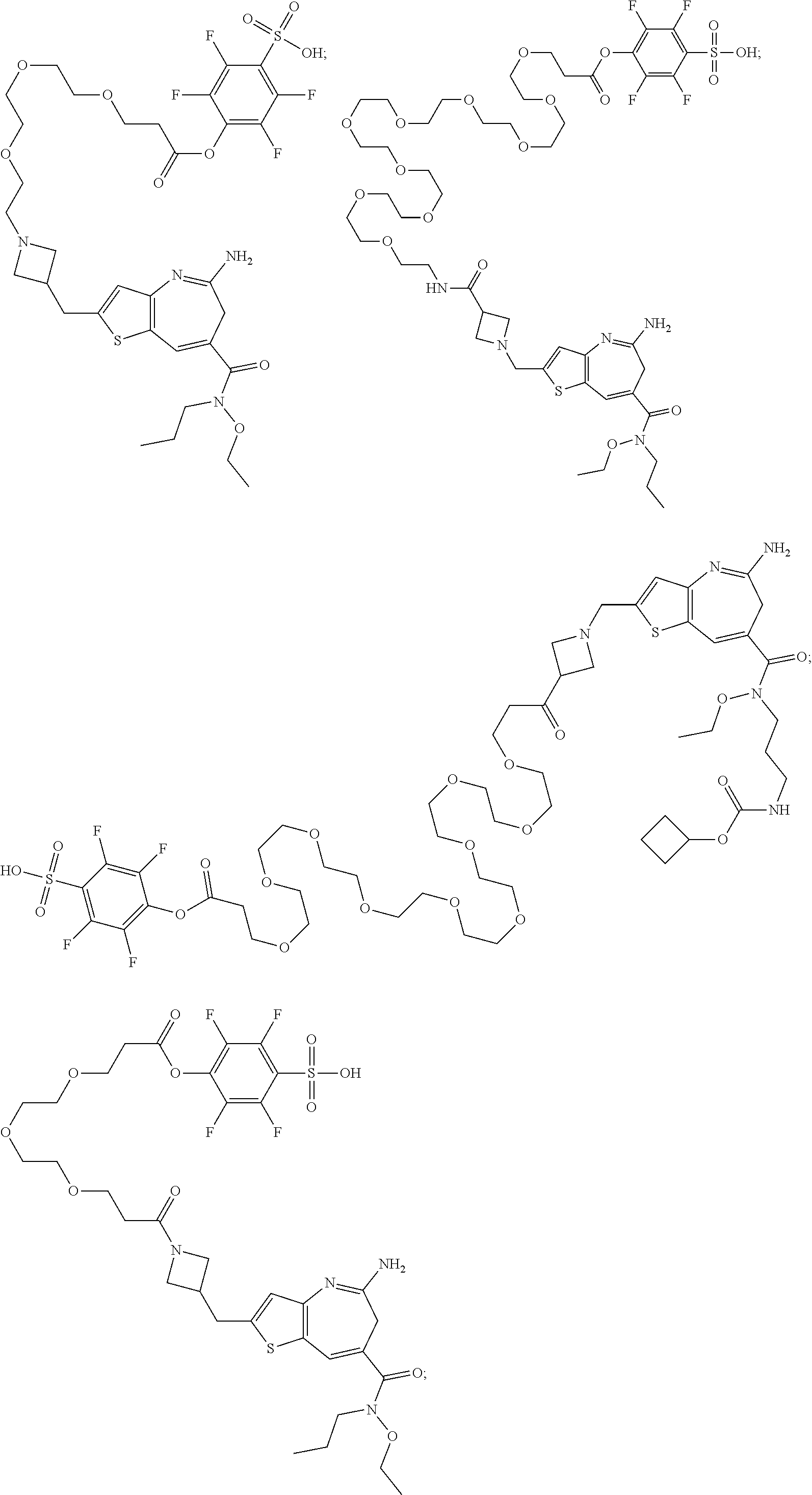 (R)-2-amino-3-((5-(5-amino-7-((3-(3,3-dimethylbutanamido)propyl)(propyl)carbamoyl)-6H-thieno[3,2-b]azepin-2-yl)pentyl)amino)-3-oxopropane-1-sulfonic acid, L-59a (0.034 g, 0.053 mmol, 1 equiv.) was dissolved in DMF (1.5 ml). To this solution were added DIPEA (0.046 ml, 0.265 mmol, 5 equiv.), followed by 34-oxo-34-(2,3,5,6-tetrafluorophenoxy)-4,7,10,13,16,19,22,25,28,31-decaoxatetratriacontanoic acid (0.037 g, 0.053 mmol, 1 equiv.). The reaction was heated to 40° C. for 20 minutes, then cooled to room temperature and purified by reverse-phase HPLC to give L-59b (0.036 g, 0.30 mmol, 58%) as a yellow film. LC/MS [M+H]1181.59 (calculated); LC/MS [M+H] 1181.87 (observed).