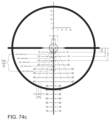 FIG. 34 is a front view of a reticle of the present invention, showing the markings as viewed through a zoom telescopic gunsight at high power suitable for use, for example, in tactical, military, and police applications;