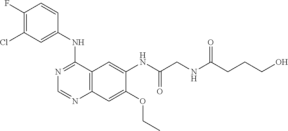 - Afatinab has been disclosed as a potential therapeutic for advanced EGFR mutated non-small cell lung cancer patients after the failure of first generation TKIs. See Zhang et al., “The efficacy and toxicity of afatinib in advanced EGFR-positive non-small-cell lung cancer patients after failure of first-generation tyrosine kinase inhibitors: a systematic review and meta-analysis,” Journal of Thoracic Disease 9(7):1980-1987 (2017).