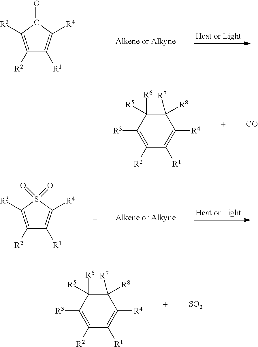 The retro or reverse Diels Alder reactions are not limited to generating furans, and can liberate dienes and other aromatic structures such as anthracenes. It may be advantageous to have one of the components be non-volatile either by virtue of its molecular weight of as a result of covalent connection to as surface, particle of polymer. These reactions will generally be most often initiated thermally, but can also be caused by light. Diels Alder reactions could also be used to thermally regulate the properties of polymers. For example, if a polymer is crosslinked by a Diels Alder reaction and this lowers the diffusion of chemical tags, thermal promotion of reverse Diels Alder reactions can be used to give an increase in the diffusion of the chemical tag or reagents associated with the generation of a chemical tag from a precursor material.