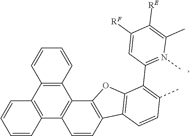 - Y is selected from the group consisting of BR′, NR′, PR′, O, S, Se, C ⁇ O, S ⁇ O, SO 2 , CR′R′′, SiR′R′′, and GeR′R′′; each R′, R′′, R F , and R G is independently a hydrogen or a substituent selected from the group consisting of deuterium, halogen, alkyl, cycloalkyl, heteroalkyl, heterocycloalkyl, arylalkyl, alkoxy, aryloxy, amino, silyl, alkenyl, cycloalkenyl, heteroalkenyl, alkynyl, aryl, heteroaryl, acyl, carboxylic acid, ether, ester