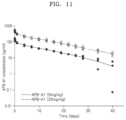 FIG. 23 ). The data represents the average of the experiments conducted. Half-lives were calculated using the data based on the ELISA result using Phoenix WinNonlin software (ver 6.4; Certara L P, Princeton, NJ, USA), and the half-lives of 10 mg/kg APB-A1 and 30 mg/kg APB-A1 were identified to be about 9.33±1.54 and 10.1±1.8 days, respectively. Cmax values were about 347 μg/m