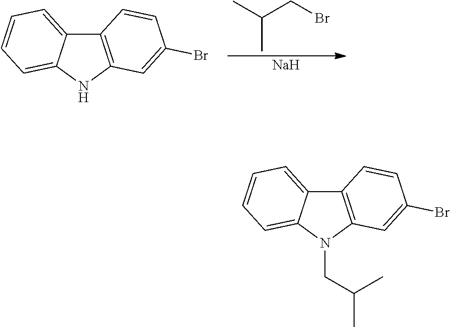 2-bromo-9H-carbazole (15.0 g, 61.0 mmol) was dissolved in dimethylformamide (DMF) (200 mL) under nitrogen and sodium hydride (6.70 g, 170 mmol) was added in portions then stirred for 15 minutes at room temperature. 1-bromo-2-methylpropane (21.7 g, 160 mmol) was added to the mixture via syringe and the reaction mixture was heated to 60° C. for 4 hours, then left at room temperature overnight. The reaction mixture was concentrated down using a rotary evaporator and the residue was extracted twice with ethyl acetate. The combined organics were washed with brine. The crude material was purified via column chromatography using a heptane/ethyl acetate (90/10) solvent system to obtain 19.0 g of 2-bromo-9-isobutyl-9H-carbazole as a white solid.