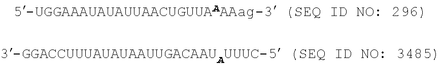 - Another aspect of the invention provides a nucleic acid possessing an oligonucleotide strand of 19-80 nucleotides in length, where the oligonucleotide strand is sufficiently complementary to a target HAO1 mRNA sequence of SEQ ID NOs: 1921-2304 along at least 19 nucleotides of the oligonucleotide strand length to reduce HAO1 target mRNA expression when the nucleic acid is introduced into a mammalian cell.