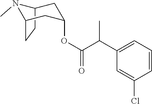 FIG. 31A is a 1H NMR spectrum of (1R,3r,5S)-8-Methyl-8-azabicyclo[3.2.1]octan-3-yl 2-(3-chlorophenyl)-3-hydroxy-2-methyl propanoate. FIG. 31B is a 13C NMR spectrum of (1R,3r,5S)-8-Methyl-8-azabicyclo[3.2.1]octan-3-yl 2-(3-chlorophenyl)-3-hydroxy-2-methyl propanoate.