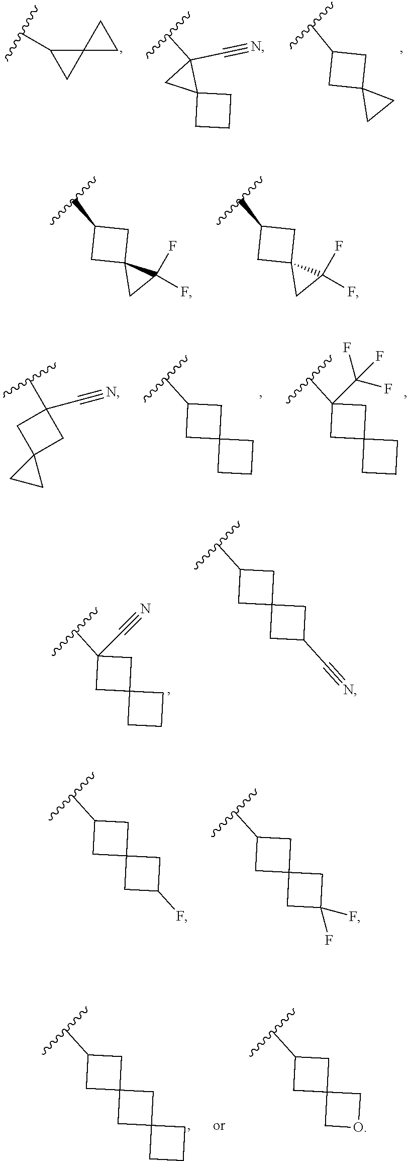 “Spiro” refers to a ring substituent which is joined by two bonds at the same carbon atom. Examples of spiro groups include 1,1-diethylcyclopentane, dimethyl-dioxolane, and 4-benzyl-4-methylpiperidine, wherein the cyclopentane and piperidine, respectively, are the spiro substituents. In some embodiments the spiro substituent is a spiropentanyl (spiro[a.b]pentanyl), spirohexanyl, spiroheptanyl, or spirodecanyl. In some embodiments the spiro substituent is