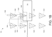 FIG. 1A is a schematic block diagram of a symmetric routing schematic 100 according to an embodiment. The symmetric routing schematic 100 includes antenna elements, 102A, 102B, 102C, 102N, 102E, 102F, 102G, 102H, 102I, 102J, 102K, 102L, 102M, 102N, 102O, and 102P (collectively referred to herein as 102). The symmetric routing schematic 100 also includes a chip 104A, 104E, 104I, and 104M (collectively referred to herein as 104). The symmetric routing schematic 100 includes a transceiver 110 and routing paths 106A, 106B, 106C, 106D, 106E, 106F, 106G, 106H, 106I, 106J, 106K, 106L, 106M, 106N, 106O, 106P, 108A, 108E, 108I, and 108M (collectively referred to herein as 106) from the transceiver 110 to the antenna elements 102.