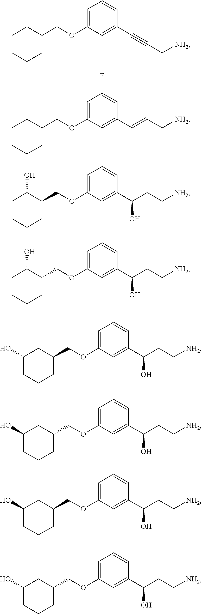 The effect of the Compounds of Examples 4, 28, and 29 (Compound 4, Compound 28, and Compound 29) and the effect of a retinoic acid receptor (RAR) agonist (E-4-[2-(5,6,7,8-tetrahydro-5,5,8,8-tetramethyl-2-naphthylenyl)-1-propenyl] benzoic acid) (TTNPB), and of all-trans-retinoic acid (at-RA), which is an RAR and retinoid X receptor (RXR) agonist, were studied on RAR and RXR receptors essentially as described by Achkar et al. (Proc. Natl. Acad. Sci. USA 93:4879-84 (1996)). Results of these assays are presented in Table 11. Amounts as great as 10 μM of each of Compound 4-HCl, Compound 28-HCl, and Compound 29-HCl did not show any significant effects on retinoid nuclear receptors (RAR and RXR). By comparison, TTNPB and at-RA activated the RXRα, RARα, RARβ and RARγ receptors as expected (Table 11).