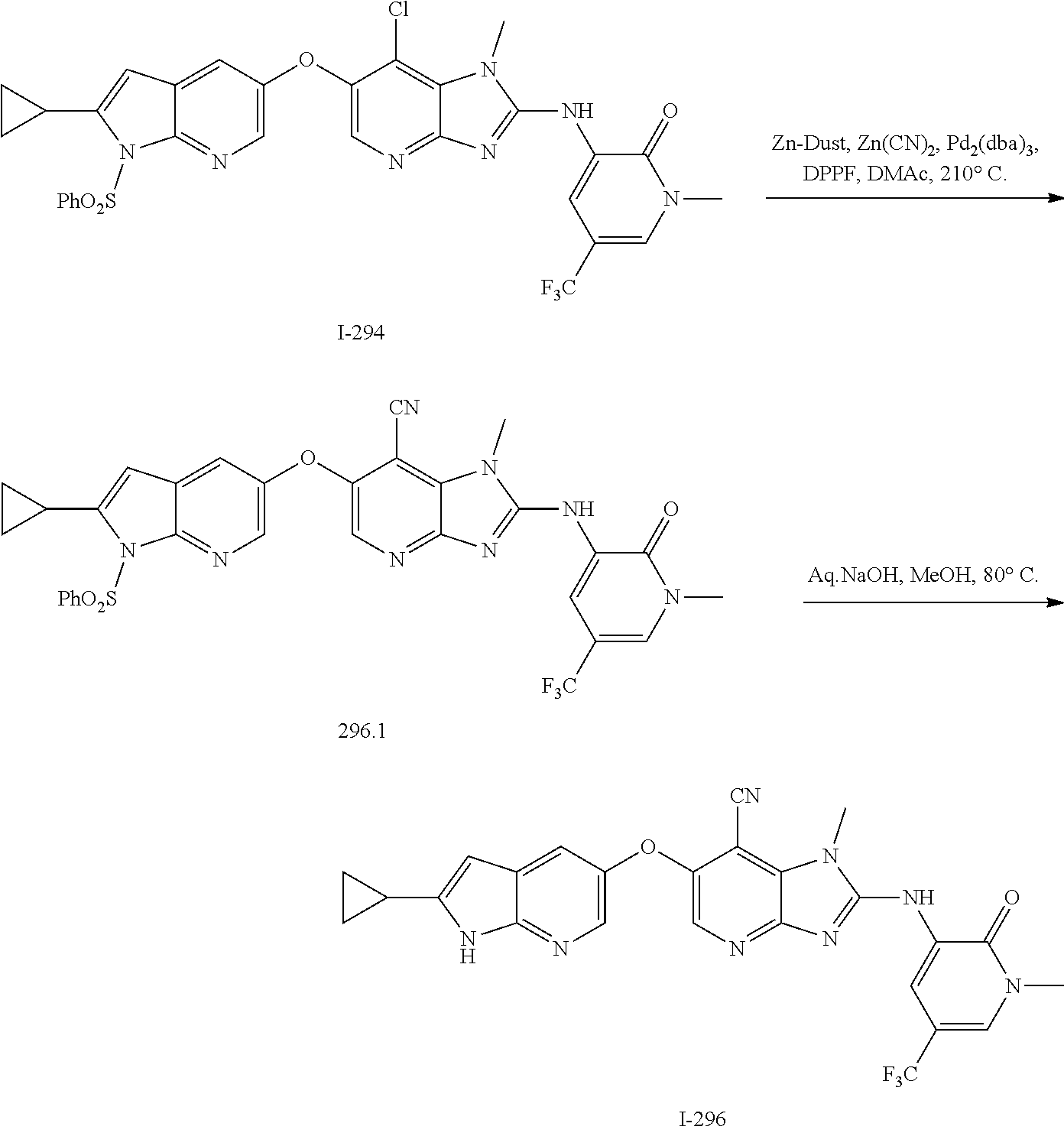 Stock solutions of test compounds are prepared in DMSO at the concentration of 10 mM, and a stock solution of control compound is prepared in DMSO at the concentration of 30 mM. Diclofenac is used as positive control in the assay. 30 μL stock solution of each compound is placed into their a 96-well rack, followed by adding 970 μL of PBS at pH 4.0 and pH 7.4 into each vial of the cap-less solubility sample plate. This study is performed in duplicate. One stir stick is added to each vial and then vials are sealed using a molded PTDE/SIL 96-Well Plate Cover. The solubility sample plate is transferred to the Thermomixer comfort plate shaker and incubated at RT for 2 hours with shaking at 1100 rpm. After 2 hours incubation, stir sticks are removed using a big magnet and all samples from the solubility sample plate are transferred into the filter plate. All the samples are filtered by vacuum manifold. The filtered samples are diluted with methanol. Samples are analyzed by LC-MS/MS and quantified against a standard of known concentration in DMSO using LC coupled with Mass spectral peak identification and quantitation. The solubility values of the test compounds are calculated as follows, wherein INJ VOL is injection volume, DF is dilution factor, and STD is standard: