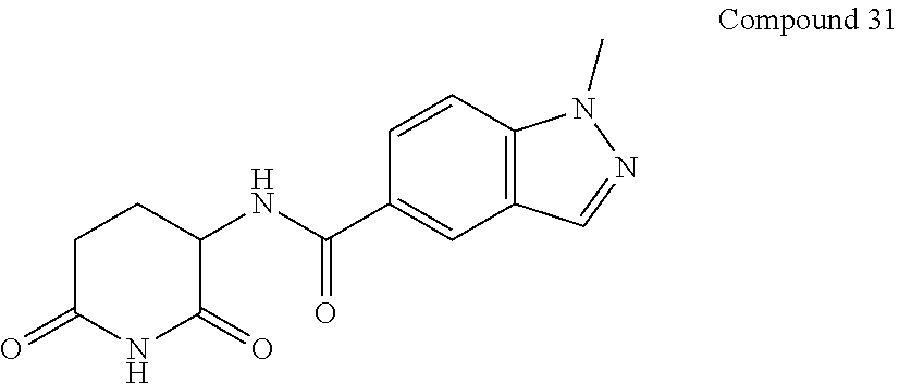 In unrelated parallel research, scientists were investigating thalidomide toxicity. Ito et al. (Science 2010, 327, 1345-1350) titled “Identification of a Primary Target of Thalidomide Teratogenicity”, described that cereblon is a thalidomide binding protein. Cereblon forms part of an E3 ubiquitin ligase protein complex which interacts with damaged DNA binding protein 1, forming an E3 ubiquitin ligase complex with Cullin 4 and the E2-binding protein ROC1 (also known as RBX1) where it functions as a substrate receptor to select proteins for ubiquitination. The study revealed that thalidomide-cereblon binding in vivo may be responsible for thalidomide teratogenicity. After the discovery that thalidomide causes teratogenicity in the mid-1960's, the compound and related structures were notwithstanding found to be useful as anti-inflammatory, anti-angiogenic and anti-cancer agents (see Bartlett et al. (Nat. Rev. Cancer 2004, 4, 314-322) titled “The Evolution of Thalidomide and Its Imid Derivatives as Anticancer Agents”).