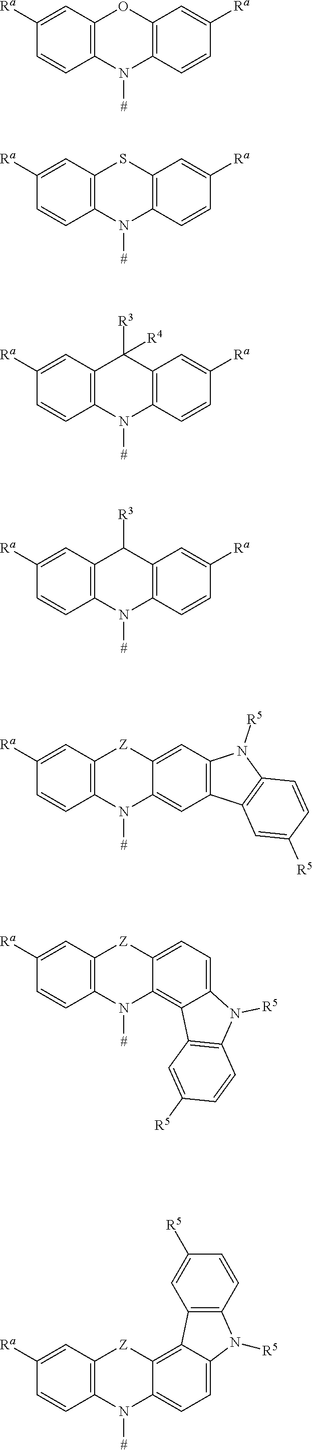 - R a , R 3 and R 4 is at each occurrence independently from another selected to be a mono- or polycyclic, aliphatic, aromatic and/or benzo-fused ring system together with one or more of the other R a , R 3 , R 4 or R 5 within the organic molecule; it is preferred for R a , R 3 and R 4 to form the mono- or polycyclic, aliphatic, aromatic and/or benzo-fused ring system with an immediately ring-adjacent substituent R a , R 3 , R 4 or R 5 .