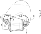 The outer clip 990 and inner clip 890 couple the seal 706 to the frame 710″″. When coupled, the outer clip 990 and inner clip 890 are disposed around and encircle the outlet collar 740. In the illustrated embodiment, the outer clip 990 is disposed on a patient-distal side of the connecting wall 895 of the inner clip 890. When the outer clip 990 and inner clip 890, along with the seal 706, are fully connected to the frame 710″″, as shown in, for example, FIG. 115 , a patient-distal end or edge of the inner wall 891 of the inner clip 890 and/or a patient-distalmost surface of the outer clip 990 may abut the surrounding wall 735 as shown. The outer clip 990 and the inner clip 890 can be coupled to each other. For example, the outer clip 990 and the inner clip 890 can be coupled via ultrasonic welding, adhesive bonding, and/or a permanent or removable snap fit. In the illustrated embodiment, an inner surface of the inner wall 791 of the outer clip 990 abuts and/or is coupled to a portion of an outer surface of the inner wall 891 of the inner clip 890.