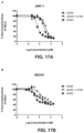 FIGS. 37A-37B depict the ability of an anti-HER2 biparatopic antibody and an anti-HER2 biparatopic-ADC to inhibit growth of cell lines expressing HER2, and EGFR and/or HER3 at the 3+, 2+ or 1+ levels. FIG. 37A depicts the ability of v10000 to inhibit growth selected cell lines. FIG. 37B depicts the ability of v10553 to inhibit growth of selected cell lines.