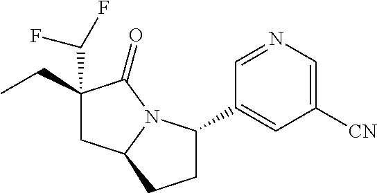5-(6-(difluoromethyl)-7-oxo-6-propylhexahydropyrazolo[1,2-a]pyrazol-1-yl)nicotinonitrile: To a solution of 5-(6-allyl-6-(difluoromethyl)-7-oxohexahydropyrazolo[1,2-a]pyrazol-1-yl)nicotinonitrile (400 mg, 402.11 umol) in EtOAc (5 mL) was added 10% Pd/C (43 mg) in one portion at 25° C. The mixture was stirred for 2 h under H2 at 15 psi. The mixture was filtered through a pad of celite. The filtrate was concentrated under vacuum. The residue was purified by prep-HPLC with the following conditions: column: Waters Xbridge 150 mm×25 mm 5 μm; Mobile phase A: water (0.05% HCl); Mobile phase B: ACN; B %: 20%-40% over 12 min to provide the title compound as a mixture of enantiomers. 1H NMR (400 MHz, CDCl3): δ 8.79 (d, J=1.8 Hz, 1H), 8.77 (d, J=2.0 Hz, 1H), 7.93-7.87 (m, 1H), 6.08-5.76 (t, J=56 Hz, 1H), 5.10 (t, J=8.0 Hz, 1H), 3.56 (dd, J=12.1, 2.0 Hz, 1H), 3.46-3.40 (m, 1H), 3.35 (t, J=7.8 Hz, 1H), 2.92-2.83 (m, 1H), 2.65-2.55 (m, 1H), 2.21 (m, 1H), 1.84-1.73 (m, 1H), 1.68-1.54 (m, 2H), 1.41-1.26 (m, 1H), 0.98 (t, J=7.3 Hz, 3H). HPLC (Method T): Retention Time: 2.049 min, m/z=321.2 [M+H]+.
