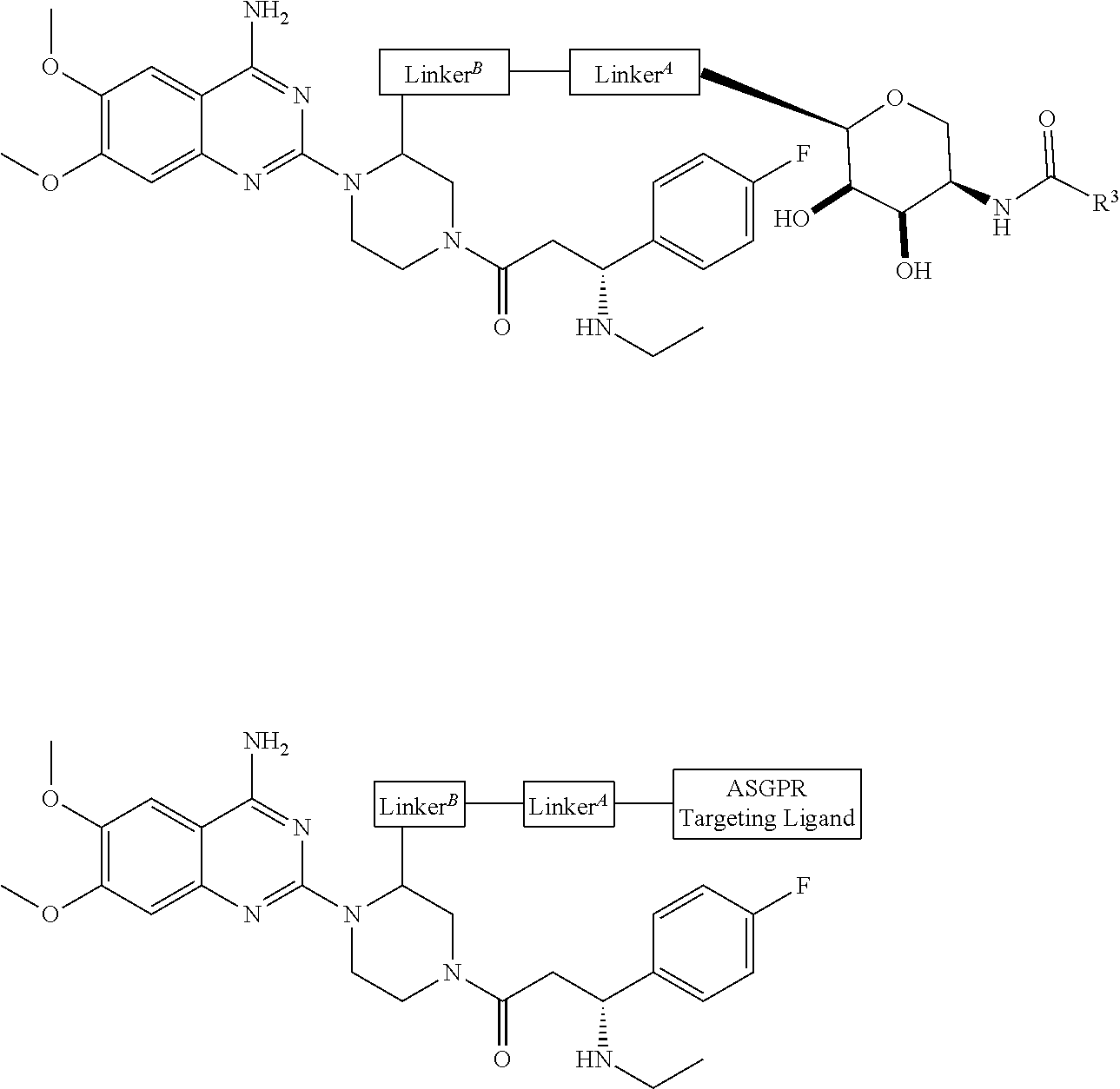 Pfizer Inc. and Wave Life Sciences Ltd. jointly disclosed the use of selected ASGPR ligands attached to oligonucleotides in PCT Applications WO 2018/223073 and WO2018/223081. The '073 application describes the use of APOC3 oligonucleotides attached to an ASGPR targeting ligand for selective delivery to the liver and the '081 application describes the use of PNPLA3 oligonucleotides attached to an ASGPR targeting ligand. PCT Application WO 2018/223056 assigned to Wave Sciences Ltd. describes compositions comprising oligonucleotides for RNA interference and in one embodiment, the oligonucleotide is attached to an ASGPR targeting ligand.