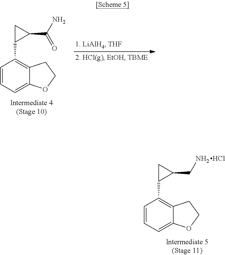 The synthesis of Intermediate 4 can comprise liberation of the free carboxylic acid from (1R,2R)-2-(2,3-dihydrobenzofuran-4-yl)cyclopropanecarboxylic acid (+)-dehydroabietylamine salt (Intermediate 3) followed by conversion via the corresponding acid chloride to the amide, (1R,2R)-2-(2,3-dihydrobenzofuran-4-yl)cyclopropane-carboxamide (Intermediate 4 (Stage 10)). Said reaction sequence is illustrated in the following scheme: