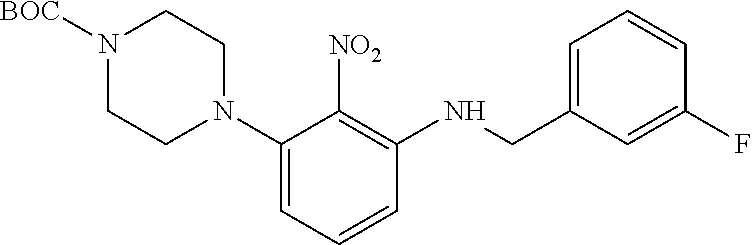 Initially, 2,6-difluoronitrobenzene A-1 was treated with piperazine derivative (R1=Me, BOC) in the presence of a base (typically K2CO3). The resulting product A-2 was reacted subsequently with benzylamine (R2=aryl, heteroaryl) in the presence of the base (typically K2CO3), providing compound A-3. Next, bisaniline A-4 was prepared by a reduction of the nitro group in A-3 with either sodium dithionite at elevated temperature or metallic iron. Finally, reaction of the bisaniline A-4 with TFA and subsequent HCl salt formation gave expected benzimidazoles A-5.