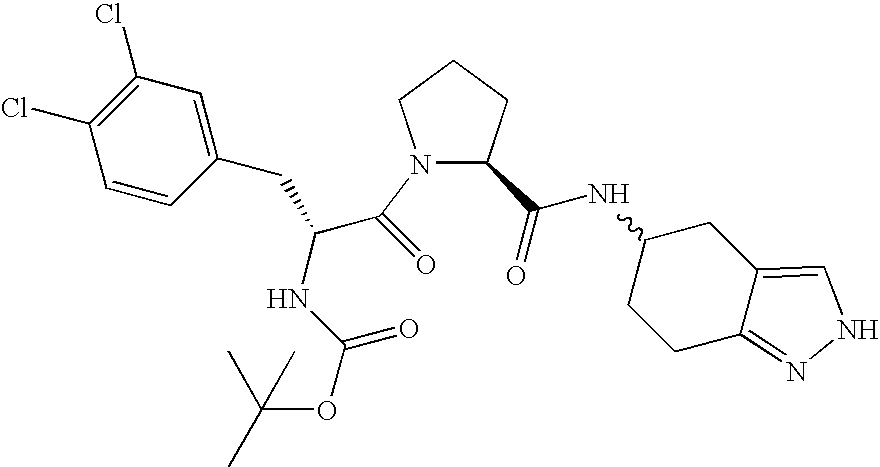 - YATITYZYEBKANM-FCRIIEAOSA-N tert-butyl n-[(2r)-3-(3,4-dichlorophenyl)-1-oxo-1-[(2s)-2-(4,5,6,7-tetrahydro-1h-indazol-5-ylmethylcarbamoyl)pyrrolidin-1-yl]propan-2-yl]carbamate Chemical compound C([C@@H](NC(=O)OC(C)(C)C)C(=O)N1[C@@H](CCC1)C(=O)NCC1CC2=CNN=C2CC1)C1=CC=C(Cl)C(Cl)=C1 YATITYZYEBKANM-FCRIIEAOSA-N 0.000 claims description 4