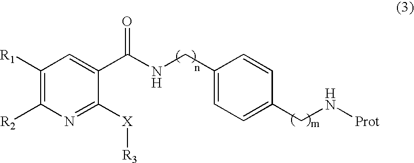 - (4-{[(2-Chloro-pyridine-3-carbonyl)-amino]-methyl}-benzyl)-carbamic acid tert-butyl ester (12.0 g, 32.2 mmol) (see Preparation 7), 3-hydroxy-benzoic acid ethyl ester (6.42 g, 38.6 mmol) and caesium carbonate (15.7 g, 48.3 mmol) were stirred in dioxan (180 ml) at 70° C. under an atmosphere of nitrogen for 18 hours. Starting material remained, so a further aliquot of 3-hydroxy-benzoic acid ethyl ester (6.42 g, 38.6 mmol) and caesium carbonate (15.7 g, 48.3 mmol) were added along with dioxan (420 ml) and N,N-dimethylformamide (40 ml) and the reaction stirred at 70° C. for a further 22 hours. The solvent was then removed under reduced pressure, the residue partitioned between ethyl acetate (200 ml) and water (200 ml), and the organic layer separated. The organic layer was then washed with a saturated aqueous solution of sodium chloride (3-fold 100 ml), the solvent removed in vacuo and the residue purified by flash column chromatography on silica gel eluting with a solvent gradient of 0:100 changing to 50:50, by volume, ethyl acetate:hexane to give 3-{3-[4-tert-butoxycarbonylamino-methyl)-benzylcarbamoyl]-pyridin-2-yloxy}benzoic acid ethyl ester (7.42 mg) as an off-white foam.