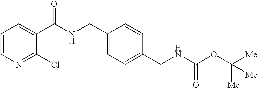 - 2-Chloro-nicotinic acid (2.86 g, 18.2 mmol), 1-hydroxybenzotriazole (3.0 g, 21.8 mmol) and 1-(3-dimethylaminopropyl)-3-ethylcarbodiimide hydrochloride (4.18 g, 21.8 mmol) were dissolved in N,N-dimethylformamide (50 ml) at room temperature and (4-aminomethyl-benzyl)-carbamic acid tert-butyl ester (4.29 g, 18.2 mmol) (see Preparation 1) added followed by addition of N-methyl morpholine (4 ml, 36.3 mmol). The reaction mixture was stirred under an atmosphere of nitrogen at room temperature for 18 hours, then partitioned between ethyl acetate (100 ml) and water (100 ml) and the organic layer separated. The organic layer was then washed with a saturated aqueous solution of sodium chloride (100 ml), dried over anhydrous magnesium sulphate and the solvent removed in vacuo. The residue was then triturated with diethylether (2-fold 10 ml) to give (4-{[(2-chloro-pyridine-3-carbonyl)-amino]-methyl}-benzyl)-carbamic acid tert-butyl ester (6.71 g) as a white solid.