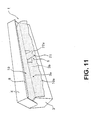 11 and 21, material of the plate springs 12 and 22 is selected such that thefilm holding devices 12 a, 12 b, and 22 a of the plate springs 12 and 22 which are the energizing means for always energizing the pulled out wrappingtongues film 10 toward the direction departing from the pullout opening-formedsurface 3 b are used as the adhesive means for allowing thewrapping film 10 to adhere onto or to electrostatically contact with the top surfaces of the 12 a, 12 b and 22 a of the plate springs 12 and 22. By this selection of the material of the plate springs, in manufacturing thetongues wrapping film container 1 in which gripping of the pulled out wrapping film is made easier, the manufacturing cost can be reduced because the step of providing the adhesive means is not necessary. However, the adhesive means is not limited to that described above, and may be provided separately to the plate springs 12 and 22, or adhesive may be applied on the top surface of the 12 a, 12 b, and 22 a of the plate springs 12 and 22, for example.tongues - Also, while the wrapping