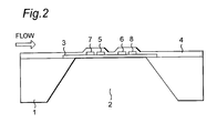 - the fluid flow rate measuring apparatus further includes a first heating element 5 , a second heating element 6 , a first temperature detecting element 7 and a second temperature detecting element 8 , which are provided on the insulating layer 3 .