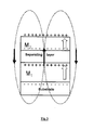 FIG. 3 is a schematic representation of two magnetic layers with magnetization perpendicular to their plane, separated by a non-magnetic layer. M1 and M2 are the magnetizations of the two layers, the outline arrows represent the direction of the magnetizations of these layers and the solid arrows schematically show the magnetic fields radiated from one layer to the other and tending to align the magnetizations of the two magnetic layers parallel to each other. Reducing the lateral dimensions causes positive and negative magnetostatic charges to appear at the interfaces of the magnetic layers, giving rise to magnetostatic coupling that encourages parallel alignment of the magnetizations of the two magnetic layers.