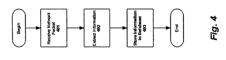 - FIG. 4 is a block diagram of a typical method for collecting network transaction data whereby a system receives a network packet, extracts information from that packet, and stores the resulting information in a database;