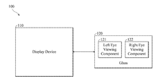 - the glass 120 has a left eye viewing component 121 and a right eye viewing component 122 .