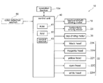- the printer head 22 includes, for example: a black head 22 K for discharging black ink, a magenta head 22 M for discharging magenta ink, a yellow head 22 Y for discharging yellow ink, a cyan head 22 C for discharging cyan ink, and a white head 22 W for discharging white ink.