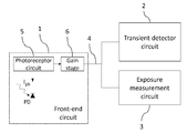 - the pixel circuit comprises a front-end circuit 1 , a transient detector circuit 2 , and an exposure measurement circuit 3 .