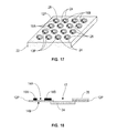 FIG. 15 , there is a pictorial representation of the exemplary structure ofFIG. 14 after affixing a micro-energy source 28 (as defined above) to the adhesive; although a single micro-energy source is described and illustrated, a plurality can be formed in each electro-optical module assembly area. The affixing includes picking amicro-energy source 28, placing themicro-energy source 28 on the adhesive applied to the each electro-optical module assembly area, and curing to form a permanent bond. A vacuum may or may not be maintained to theoptical component holder 22 throughout this step of present application. - Referring now to