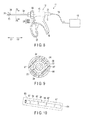 FIG. 8 , the hand piece 12 (assembly unit) is provided with: aresin housing 15 constituting an outer shell; a fixedhandle 16 fixed to thehousing 15; amovable handle 17 movable relative to thehousing 15; acase 21 detachably attached to thehousing 15; a vibration generator 22 (transducer) stored in thecase 21; a rod-like vibration transmission member 23 (shaft unit; probe) connected to thevibration generator 22; acylindrical sheath 24 covering the periphery of thevibration transmission member 23 and protecting thevibration transmission member 23; ajaw 36 provided at the distal end portion of thesheath 24 and being rotatable relative to thesheath 24; a cylindrical driving pipe provided inside thesheath 24 and being movable back and forth when thejaw 36 is opened or closed; a knob 65 (rotating knob) fixed to thesheath 24; and a plurality ofoperation buttons 28 provided on thehousing 15. Thesheath 24 is an example of a medical member. - The