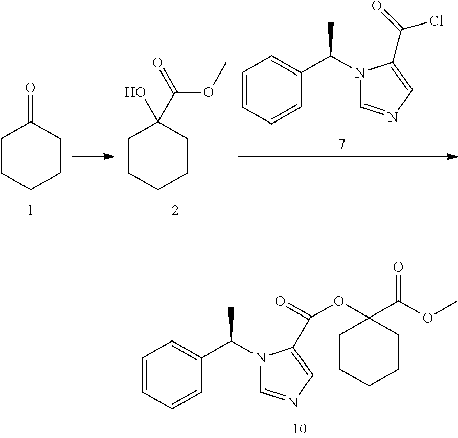- ACKDHRVMJJSEDR-ABFGLHGNSA-N COC(=O)C1(O)CCCCC1.COC(=O)C1(OC(=O)C2=CN=CN2[C@H](C)C2=CC=CC=C2)CCCCC1.C[C@H](C1=CC=CC=C1)N1C=NC=C1C(=O)Cl.O=C1CCCCC1 Chemical compound COC(=O)C1(O)CCCCC1.COC(=O)C1(OC(=O)C2=CN=CN2[C@H](C)C2=CC=CC=C2)CCCCC1.C[C@H](C1=CC=CC=C1)N1C=NC=C1C(=O)Cl.O=C1CCCCC1 ACKDHRVMJJSEDR-ABFGLHGNSA-N 0.000 description 1