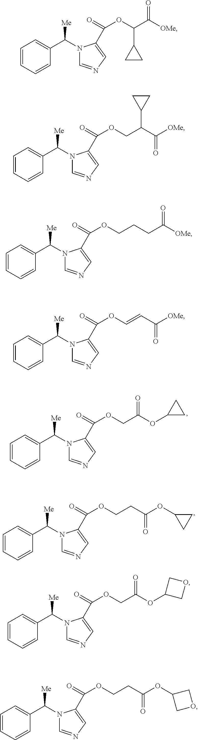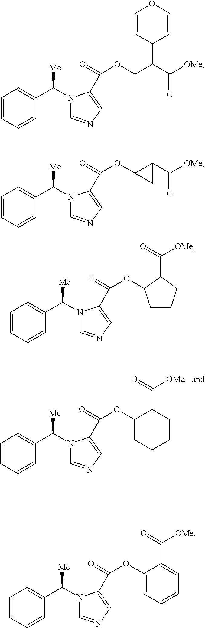 - QAGFMCJGOKBMGS-NILDKROUSA-N COC(=O)C(C)(C)OC(=O)C1=CN=CN1[C@H](C)C1=CC=CC=C1.COC(=O)C1(OC(=O)C2=CN=CN2[C@H](C)C2=CC=CC=C2)CC1.COC(=O)[C@@H](C)COC(=O)C1=CC=CN1[C@H](C)C1=CC=CC=C1.COC(=O)[C@@H](C)OC(=O)C1=CN=CN1[C@H](C)C1=CC=CC=C1.COC(=O)[C@@H](OC(=O)C1=CN=CN1[C@H](C)C1=CC=CC=C1)C(C)C.COC(=O)[C@H](C)COC(=O)C1=CC=CN1[C@H](C)C1=CC=CC=C1.COC(=O)[C@H](C)OC(=O)C1=CN=CN1[C@H](C)C1=CC=CC=C1.COC(=O)[C@H](OC(=O)C1=CN=CN1[C@H](C)C1=CC=CC=C1)C(C)C Chemical compound COC(=O)C(C)(C)OC(=O)C1=CN=CN1[C@H](C)C1=CC=CC=C1.COC(=O)C1(OC(=O)C2=CN=CN2[C@H](C)C2=CC=CC=C2)CC1.COC(=O)[C@@H](C)COC(=O)C1=CC=CN1[C@H](C)C1=CC=CC=C1.COC(=O)[C@@H](C)OC(=O)C1=CN=CN1[C@H](C)C1=CC=CC=C1.COC(=O)[C@@H](OC(=O)C1=CN=CN1[C@H](C)C1=CC=CC=C1)C(C)C.COC(=O)[C@H](C)COC(=O)C1=CC=CN1[C@H](C)C1=CC=CC=C1.COC(=O)[C@H](C)OC(=O)C1=CN=CN1[C@H](C)C1=CC=CC=C1.COC(=O)[C@H](OC(=O)C1=CN=CN1[C@H](C)C1=CC=CC=C1)C(C)C QAGFMCJGOKBMGS-NILDKROUSA-N 0.000 description 1