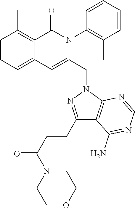 - SGRDQZPHPGSERE-GQSXLMTNSA-N CC(=O)N1CCN(CC2=NN(CC3=CC4=CC=CC(C)=C4C(=O)N3C3=C(C)C=CC=C3)C3=C2C(N)=NC=N3)CC1.CC1=C2C(=O)N(C3=C(C)C=CC=C3)C(CN3N=C(/C=C4/CCNC4=O)C4=C3N=CN=C4N)=CC2=CC=C1.CC1=C2C(=O)N(C3=C(C)C=CC=C3)C(CN3N=C(CN4CCN(S(C)(=O)=O)CC4)C4=C3N=CN=C4N)=CC2=CC=C1.CC1=C2C(=O)N(C3=C(C)C=CC=C3)C(CN3N=C(CN4CCOCC4)C4=C3N=CN=C4N)=CC2=CC=C1.CC1=C2C(=O)N(C3CCN(C)CC3)C(CN3N=C(C4=CC=C5OC(N)=NC5=C4)C4=C3N=CN=C4N)=CC2=CC=C1 Chemical compound CC(=O)N1CCN(CC2=NN(CC3=CC4=CC=CC(C)=C4C(=O)N3C3=C(C)C=CC=C3)C3=C2C(N)=NC=N3)CC1.CC1=C2C(=O)N(C3=C(C)C=CC=C3)C(CN3N=C(/C=C4/CCNC4=O)C4=C3N=CN=C4N)=CC2=CC=C1.CC1=C2C(=O)N(C3=C(C)C=CC=C3)C(CN3N=C(CN4CCN(S(C)(=O)=O)CC4)C4=C3N=CN=C4N)=CC2=CC=C1.CC1=C2C(=O)N(C3=C(C)C=CC=C3)C(CN3N=C(CN4CCOCC4)C4=C3N=CN=C4N)=CC2=CC=C1.CC1=C2C(=O)N(C3CCN(C)CC3)C(CN3N=C(C4=CC=C5OC(N)=NC5=C4)C4=C3N=CN=C4N)=CC2=CC=C1 SGRDQZPHPGSERE-GQSXLMTNSA-N 0.000 description 1