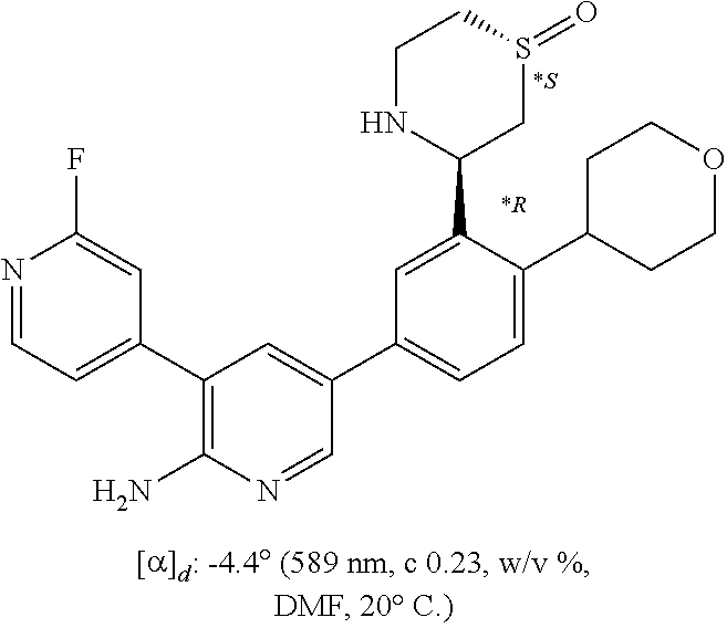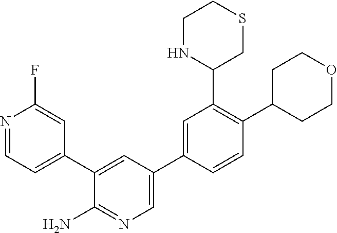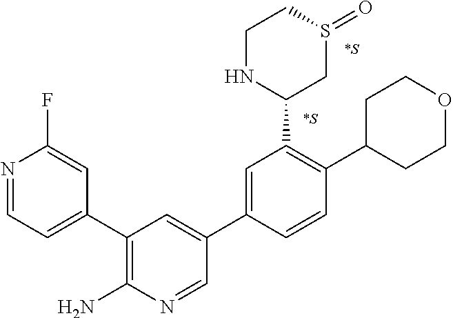 - MEBXKZZGSKQAJZ-NHRFMIRVSA-N Nc1ncc(-c2ccc(C3CCOCC3)c([C@H]3C[S@@](=O)CCN3)c2)cc1-c1ccnc(F)c1 Chemical compound Nc1ncc(-c2ccc(C3CCOCC3)c([C@H]3C[S@@](=O)CCN3)c2)cc1-c1ccnc(F)c1 MEBXKZZGSKQAJZ-NHRFMIRVSA-N 0.000 description 2