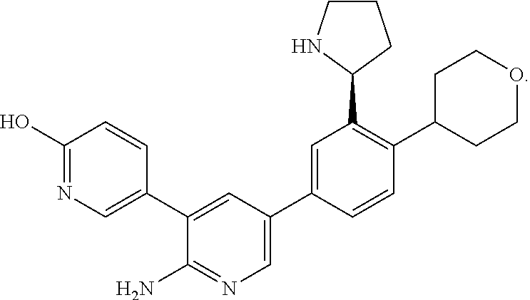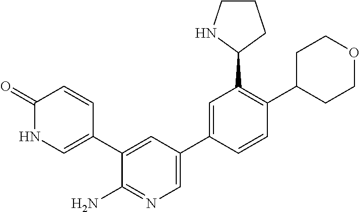 - WHFGPEJZVXMLAB-QHCPKHFHSA-N Nc1ncc(-c2ccc(C3CCOCC3)c([C@@H]3CCCN3)c2)cc1-c1ccc(=O)[nH]c1 Chemical compound Nc1ncc(-c2ccc(C3CCOCC3)c([C@@H]3CCCN3)c2)cc1-c1ccc(=O)[nH]c1 WHFGPEJZVXMLAB-QHCPKHFHSA-N 0.000 description 2