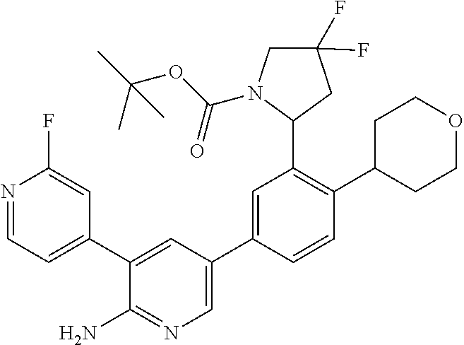 - WFVFHNXHQMXQMJ-UHFFFAOYSA-N CC(C)(C)OC(=O)N1CC(F)(F)CC1c1cc(-c2cnc(N)c(-c3ccnc(F)c3)c2)ccc1C1CCOCC1 Chemical compound CC(C)(C)OC(=O)N1CC(F)(F)CC1c1cc(-c2cnc(N)c(-c3ccnc(F)c3)c2)ccc1C1CCOCC1 WFVFHNXHQMXQMJ-UHFFFAOYSA-N 0.000 description 1