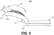 FIG. 5 is a right side view ofvegetable slicing shield 100, according to an embodiment. The midline, medial-to-distal curvature ofbasket 160 is readily visible inFIG. 5 . The left side view is a mirror image of the right side view. -