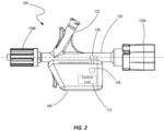 106A and 106B may be identical to each other, may be similar to each other, or may be substantially different from one another in form and function (e.g., one primarily providing power while the other primarily receives and relays data). For instance, in some embodiments, the secondelectronic devices electronic device 106B may comprise a larger power source and/or may be connected to an outside power source, such that the secondelectronic device 106B has a greater ability to provide power to the sensor(s) 208 or other electronic components associated with thehemostasis valve 104. In contrast, in some embodiments, the firstelectronic device 106A may comprise a relatively smaller form than the secondelectronic device 106B. The firstelectronic device 106A may be primarily used to receive data from and communicate to the sensor(s) 208 or other electronic components associated with thehemostasis valve 104. Additionally, the firstelectronic device 106A may be configured to communicate commands to the secondelectronic device 106B that cause the secondelectronic device 106B to adjust the power that the secondelectronic device 106B sends to particular sensors. - Referring to