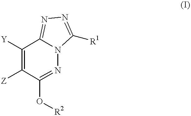 Where Y and Z are taken together with the two intervening carbon atoms to form a ring, the resulting compounds of formula I above incorporate the relevant cycloalkenyl, bicycloalkenyl, tetrahydropyridinyl, pyridinyl or phenyl ring fused to the central triazolo-pyridazine ring system as depicted in formula I.