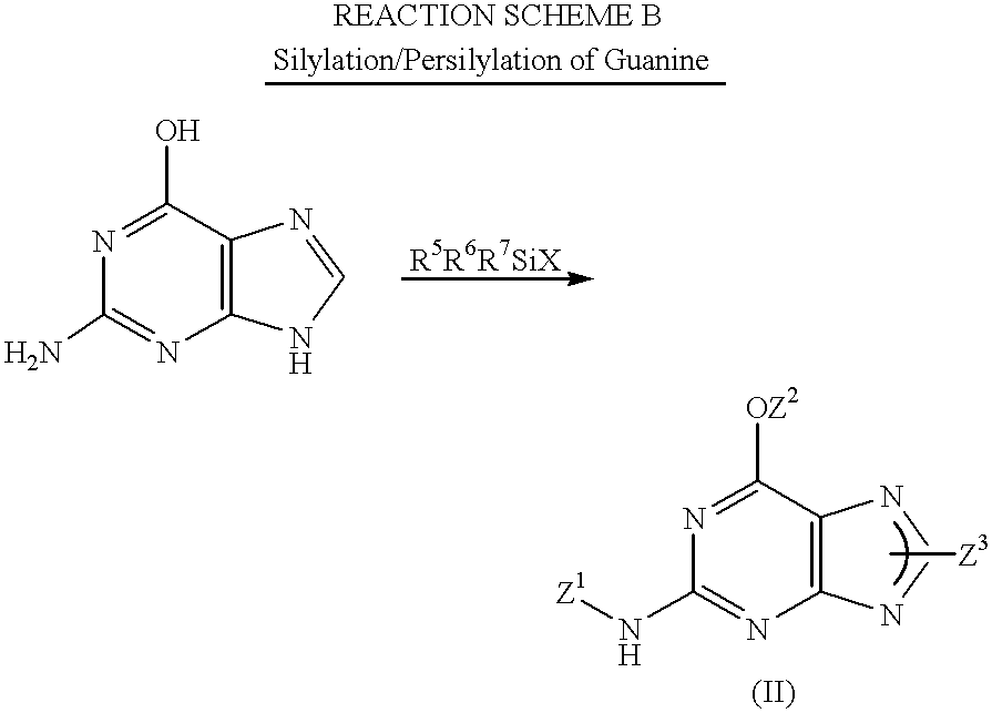 As illustrated in Reaction Scheme B, guanine is silylated to give the corresponding protected compound of Formula (II).