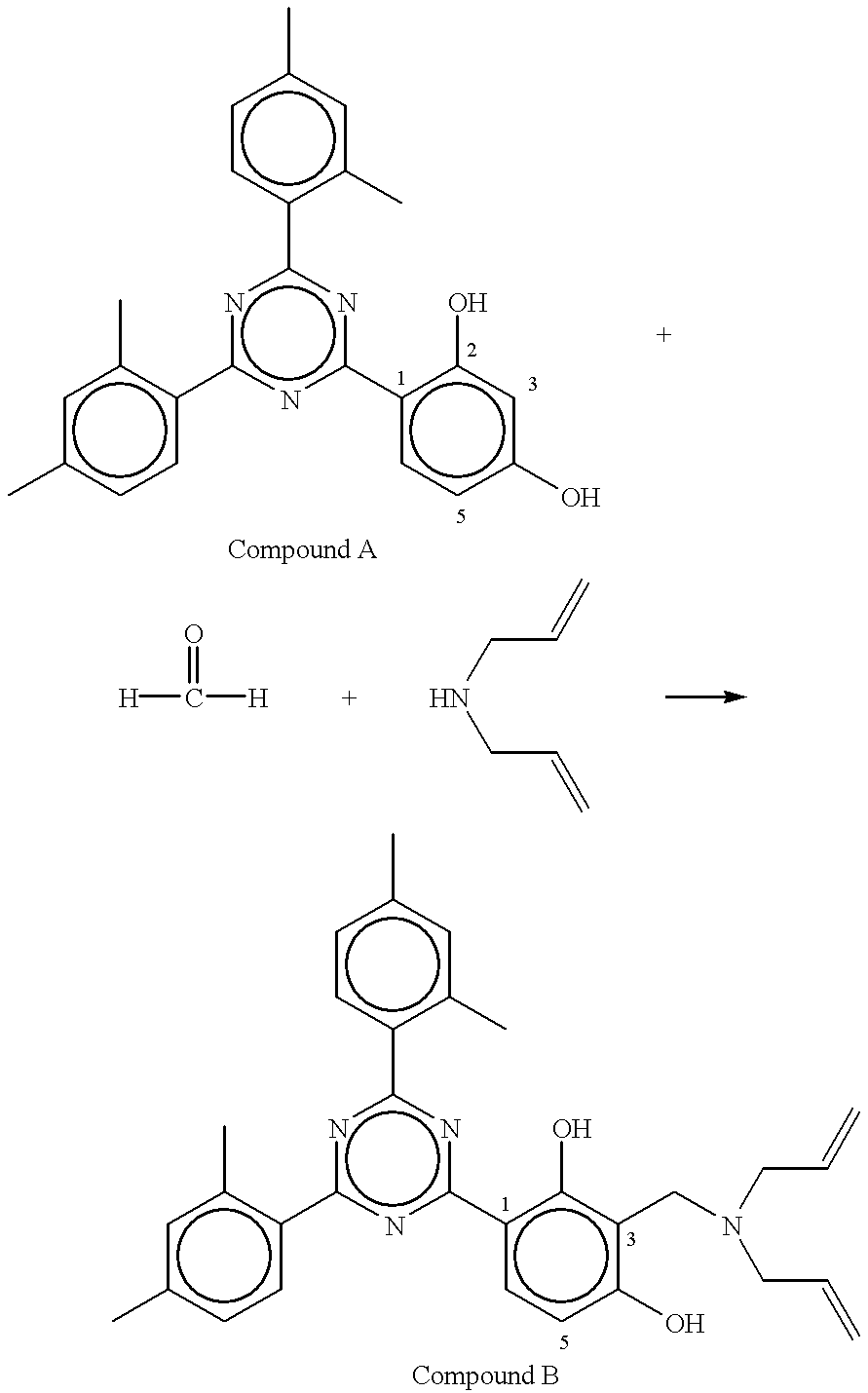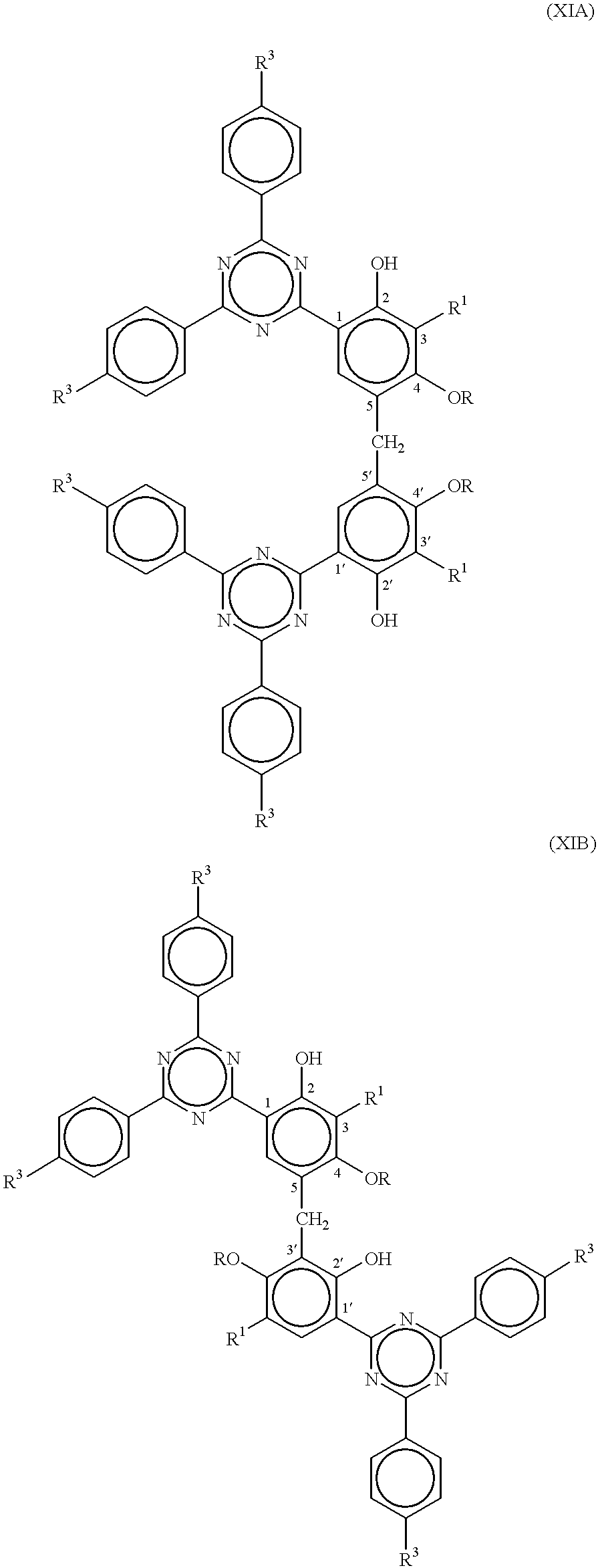 - this class of materials is well known in the art. Disclosures of a number of such trisaryl-1,3,5-triazines can be found in the patent literature. For example, U.S. Pat. No. 3,843,371 discloses hydroxyphenyltrizines for use in photographic materials. The triazines in this patent, however, show poor solubilities and poor stabilities.