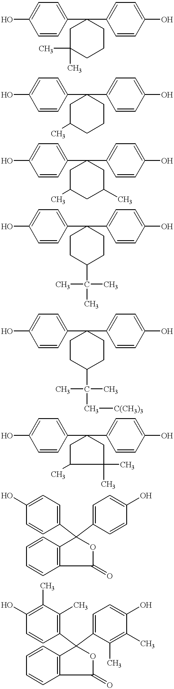 - OYGXAJXZKQBBBX-UHFFFAOYSA-N CC(C)(C)C1CCC(C2=CC=C(O)C=C2)(C2=CC=C(O)C=C2)CC1.CC(C)(C)CC(C)(C)C1CCC(C2=CC=C(O)C=C2)(C2=CC=C(O)C=C2)CC1.CC1(C)CCCC(C2=CC=C(O)C=C2)(C2=CC=C(O)C=C2)C1.CC1=C(O)C=CC(C2(C3=CC=C(O)C(C)=C3C)OC(=O)C3=C2C=CC=C3)=C1C.CC1CC(C)CC(C2=CC=C(O)C=C2)(C2=CC=C(O)C=C2)C1.CC1CC(C2=CC=C(O)C=C2)(C2=CC=C(O)C=C2)CC1(C)C.CC1CCCC(C2=CC=C(O)C=C2)(C2=CC=C(O)C=C2)C1.O=C1OC(C2=CC=C(O)C=C2)(C2=CC=C(O)C=C2)C2=C1C=CC=C2 Chemical compound CC(C)(C)C1CCC(C2=CC=C(O)C=C2)(C2=CC=C(O)C=C2)CC1.CC(C)(C)CC(C)(C)C1CCC(C2=CC=C(O)C=C2)(C2=CC=C(O)C=C2)CC1.CC1(C)CCCC(C2=CC=C(O)C=C2)(C2=CC=C(O)C=C2)C1.CC1=C(O)C=CC(C2(C3=CC=C(O)C(C)=C3C)OC(=O)C3=C2C=CC=C3)=C1C.CC1CC(C)CC(C2=CC=C(O)C=C2)(C2=CC=C(O)C=C2)C1.CC1CC(C2=CC=C(O)C=C2)(C2=CC=C(O)C=C2)CC1(C)C.CC1CCCC(C2=CC=C(O)C=C2)(C2=CC=C(O)C=C2)C1.O=C1OC(C2=CC=C(O)C=C2)(C2=CC=C(O)C=C2)C2=C1C=CC=C2 OYGXAJXZKQBBBX-UHFFFAOYSA-N 0.000 description 1