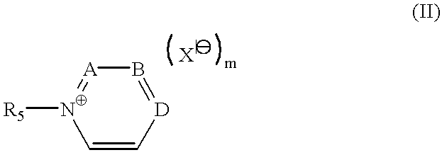 - A, B or D represents CH, N, N + R 6 , R 6 representing a hydrogen atom, a substituted or unsubstituted, linear or branched, saturated or unsaturated C 1 -C 30 alkyl radical which can be interrupted with one or more hetero atoms, it being understood that only one of the symbols A, B or D represents N or N + R 6 ; with the proviso that at least one of the radicals R 5 or R 6 comprises at least 6 carbon atoms;