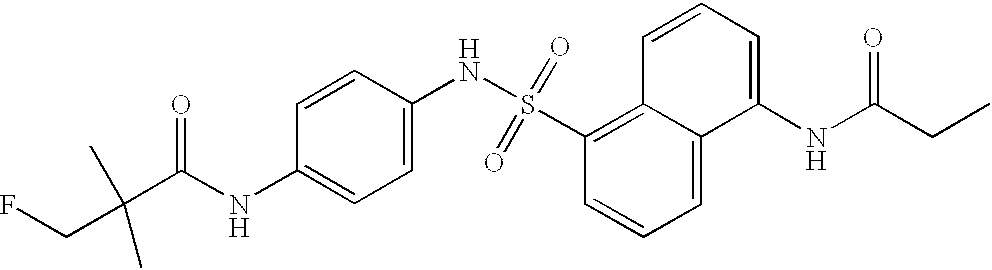 - UTLDQCHEPGQKOT-UHFFFAOYSA-N CC(C)(CF)C(=O)NC1=CC=C(NS(=O)(=O)C2=C3C=CC=C(NC(=O)C(C)(C)CO)C3=CC=C2)C=C1 Chemical compound CC(C)(CF)C(=O)NC1=CC=C(NS(=O)(=O)C2=C3C=CC=C(NC(=O)C(C)(C)CO)C3=CC=C2)C=C1 UTLDQCHEPGQKOT-UHFFFAOYSA-N 0.000 description 1
