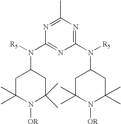 | US5844026A (en) | 1997-06-30 | 1998-12-01 | Ciba Specialty Chemicals Corporation | N,N',N''-tris{2,4-bis Hydrocarbyloxy-2,2,6,6-tetra-methylpiperidin-4-yl)alkylamino!-s-triazin-6-yl}-3,3'-ethylenediiminodipropylamines, their isomers and bridged derivatives and polymer compositions stabilized therewith |