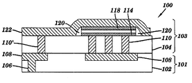 As illustrated in FIG. 10, a conductive layer or second metal line 122, such as Al, W, Au, silver, or other similar material, is formed over the capacitor 113, the spacer 120 and the surface of the second insulative layer 104, such that electrical contact is made between thee second electrode layer 118 and the second via 110′, thereby forming a second metal wiring layer 103. For instance, the second metal line 122 is deposited having a thickness in the range of approximately 10-200 nm, e.g., 500 nm, over the surface of the structure 100. Thereafter, the second metal line 122 is patterned, using a lithographic or other similar process, and etched, using RIE, or other similar process.